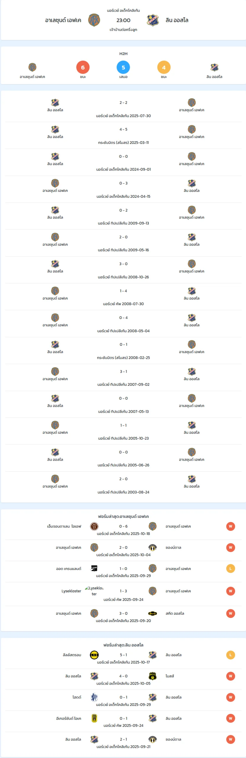 เกมล่าสุดที่ทั้งสองทีมพบกันในรายการ นอร์เวย์ อเด็กโคลิเก้น เมื่อเดือนกรกฎาคม 2025 จบลงด้วยผลเสมอ 2-2 ที่บ้านของ ลิน ออสโล ภาพรวมการเจอกัน 6 เกมล่าสุดในทุกรายการ อาเลซุนด์ มีสถิติที่ดีกว่าเล็กน้อย โดยชนะ 3 เสมอ 2 และแพ้ 1 ครั้ง จุดที่น่าสนใจคือการพบกันมักมีสกอร์สูง โดยมีถึง 6 เกมจาก 9 เกมหลังสุดที่ยิงประตูรวมมากกว่า 2.5 ลูก และทั้งสองทีมยิงประตูใส่กันได้ 2 เกมติดต่อกันแล้ว