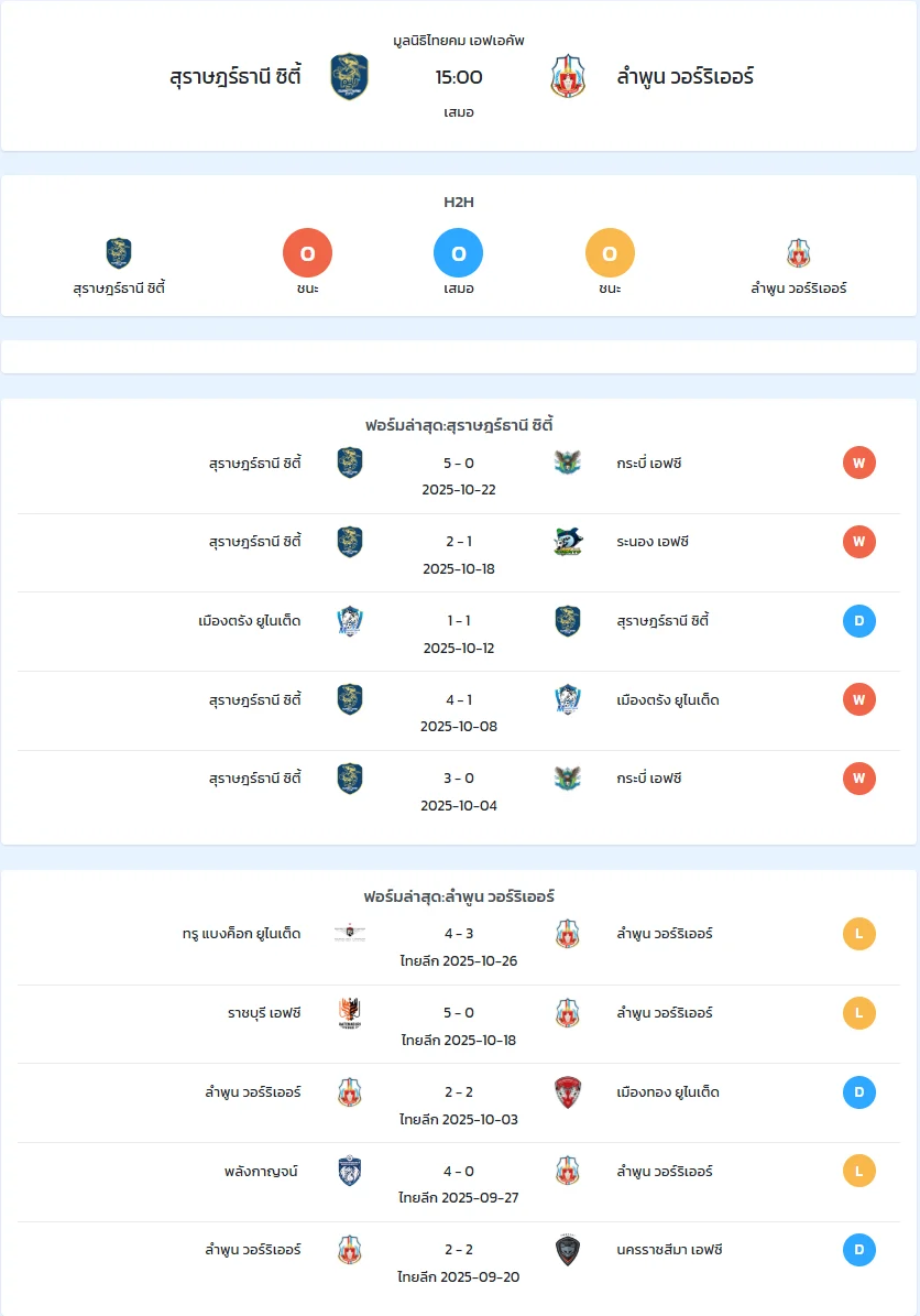 ลำพูน วอร์ริเออร์: อันดับที่ 15 (ในลีก T1) เกมล่าสุด ลำพูน วอร์ริเออร์ บุกไปแพ้ ทรู แบงค็อก ยูไนเต็ด 3-4 ฟอร์ม 6 เกมหลังสุด ชนะ 1 เสมอ 2 แพ้ 3 ไม่ชนะใคร 5 เกมติดต่อกัน และแพ้มา 2 เกมติด สถิติที่น่ากังวลคือเสียประตู 10 เกมติดต่อกัน เกมเยือนแพ้ 3 เกมติดต่อกัน และเสียประตูในเกมเยือนถึง 8 เกมจาก 9 เกมหลังสุด ฟอร์มโดยรวมถือว่าอยู่ในช่วงวิกฤต โดยมีปัญหาอย่างหนักในแนวรับที่ขาดความแน่นอน