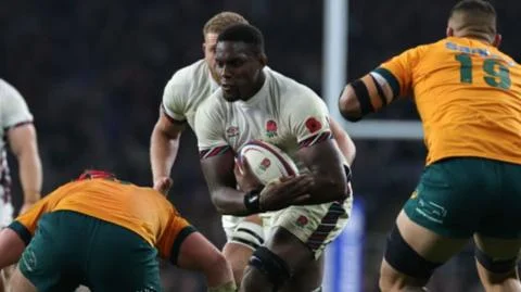 Jamie Niblock/BBC Jacques leans over the advertising hoardings, overlooking the pitch at Ipswich Wanderers' Humber Doucy Lane. He has his fingers interlinked as he looks off camera.
